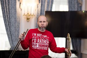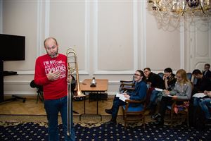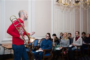 лектор. В рамках своих докладов он рассказывает о классической музыке в целом, а также об истории инструментов.