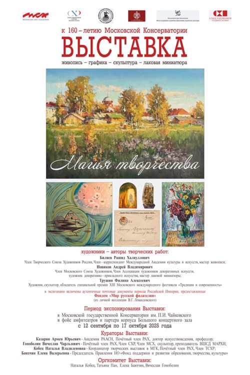 Выставка творческих работ и исторических филателистических материалов «Магия творчества» — просветительский проект, объединивший мастеров живописи, графики, скульптуры, лаковой миниатюры и знатоков мировой филателии. Проведение выставки приурочено к 160-летию Московской консерватории.