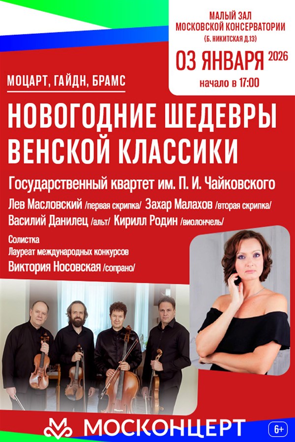 Прекрасные мелодии арий из опер «Свадьба Фигаро» и «Так поступают все» Моцарта, зажигательный Венгерский танец Брамса, вдохновенные рождественские песни и гимны и, конечно же, поэтичные вальсы, столь обожаемые венцами – все это «венское классическое» великолепие станет основой уникальной праздничной программы, главными участниками которой станут блестящие виртуозы, участники Государственного квартета имени М.И. Глинки и лауреат международных конкурсов Виктория Носовская.