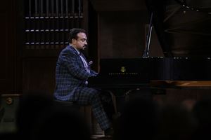Доцент кафедры медных духовых и ударных инструментов МГК, участник Специальной военной операции и ветеран боевых действий Сергей Федорович Бармин представил свой Ансамбль медных духовых инструментов, который исполнил «Фантазию на темы песен военных лет» А. Лебедева.