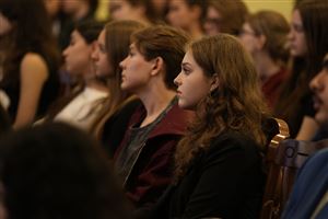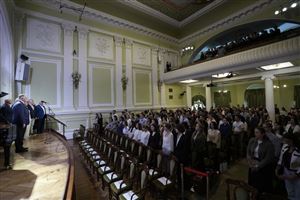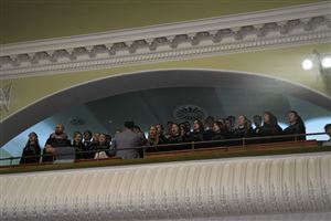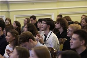 Камерный хор Московской консерватории под управлением профессора Александра Соловьёва традиционно открыл Торжественное собрание с первокурсниками исполнением Государственного гимна Российской Федерации.