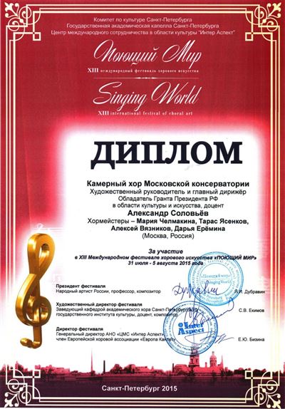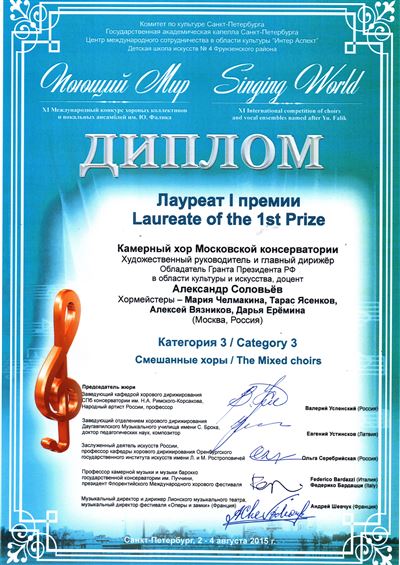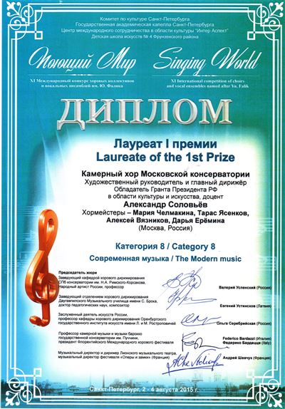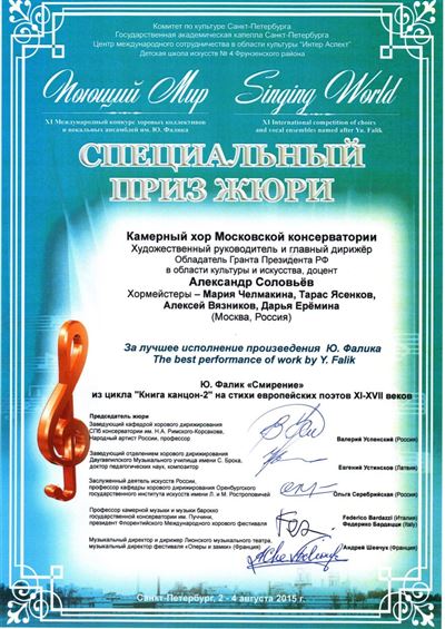 С 31 июля по 5 августа Камерный хор Московской консерватории принимал участие в XI Международном конкурсе хоровых коллективов и вокальных ансамблей имени Ю. Фалика «Поющий мир» (Санкт-Петербург). Коллектив под управлением художественного руководителя доцента А. В. Соловьёва завоевал Гран-при конкурса «Поющий мир» и стал обладателем четырех званий лауреата I премии в четырёх номинациях.