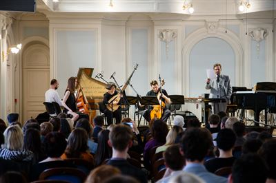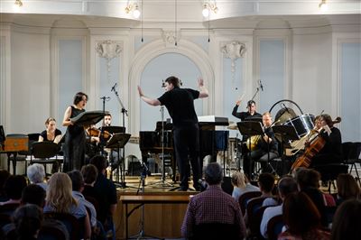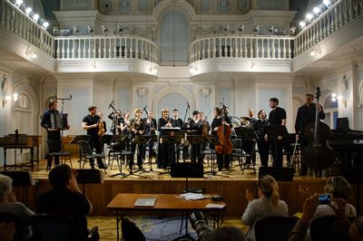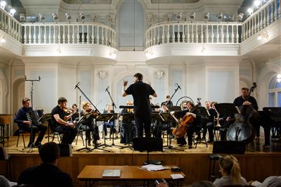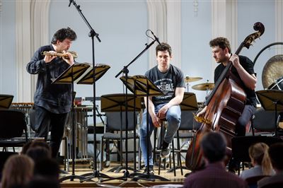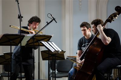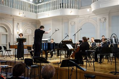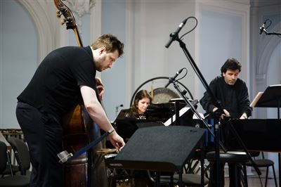 На сцене Ансамбль солистов «Студия новой музыки», дирижёр Григорий Кротенко.К 25-летнему юбилею Ансамбля солистов «Студия новой музыки».Б. Фуррер. «Ira-arca» для контрабаса и контрабасовой флейты. Исполняют Иван Бушуев (контрабасовая флейта), Григорий Кротенко (контрабас).Б. Фуррер. «Ira-arca» для контрабаса и контрабасовой флейты. Исполняют Иван Бушуев (контрабасовая флейта), Григорий Кротенко (контрабас).На сцене лауреат международных конкурсов Иван Бушуев (контрабасовая флейта).В Рахманиновском зале консерватории прошёл четвёртый концерт из серии «Карт-бланш», посвящённый 25-летнему юбилею Ансамбля солистов «Студия новой музыки».Дж. Вольфе. «Stronghold» для 8 контрабасов. Исполняют (слева направо): Александр Богомаз, Гурген Оганесян, Сергей Карачун, Григорий Кротенко, Владимир Беликов, Антон Крылов, Илья Мосалёв, Илья Паничкин.Ж. Гризе. «Partiels» для ансамбля. Исполняет Ансамбль солистов «Студия новой музыки», дирижёр Григорий Кротенко.На сцене лауреат международных конкурсов Станислав Малышев (скрипка).Ж. Гризе. «Partiels» для ансамбля. Исполняет Ансамбль солистов «Студия новой музыки», дирижёр Григорий Кротенко. На фото: Владимир Терехов (ударные инструменты).В Рахманиновском зале консерватории прошёл четвёртый концерт из серии «Карт-бланш», посвящённый 25-летнему юбилею Ансамбля солистов «Студия новой музыки».