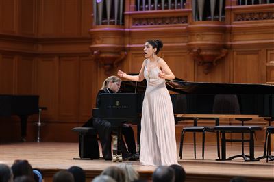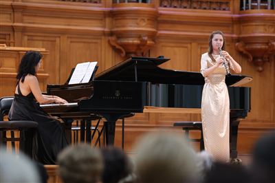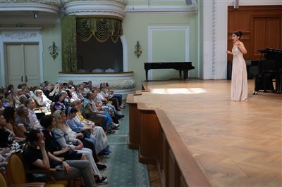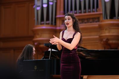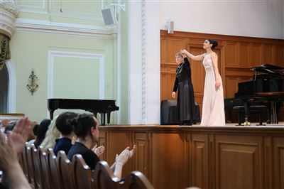 На сцене Большого зала Елена Лебедева (фортепиано) и Мария Баканина (сопрано), класс профессора Г.И. Киселёвой, СПбГК имени Н.А. Римского-Корсакова